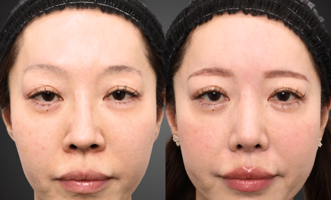 術後は正面から見た団子鼻がすっきり改善され、鼻尖と鼻柱が逆三角形の美しいラインを形成。横顔のEラインも整い、立体感のある自然な鼻へと仕上がっています。