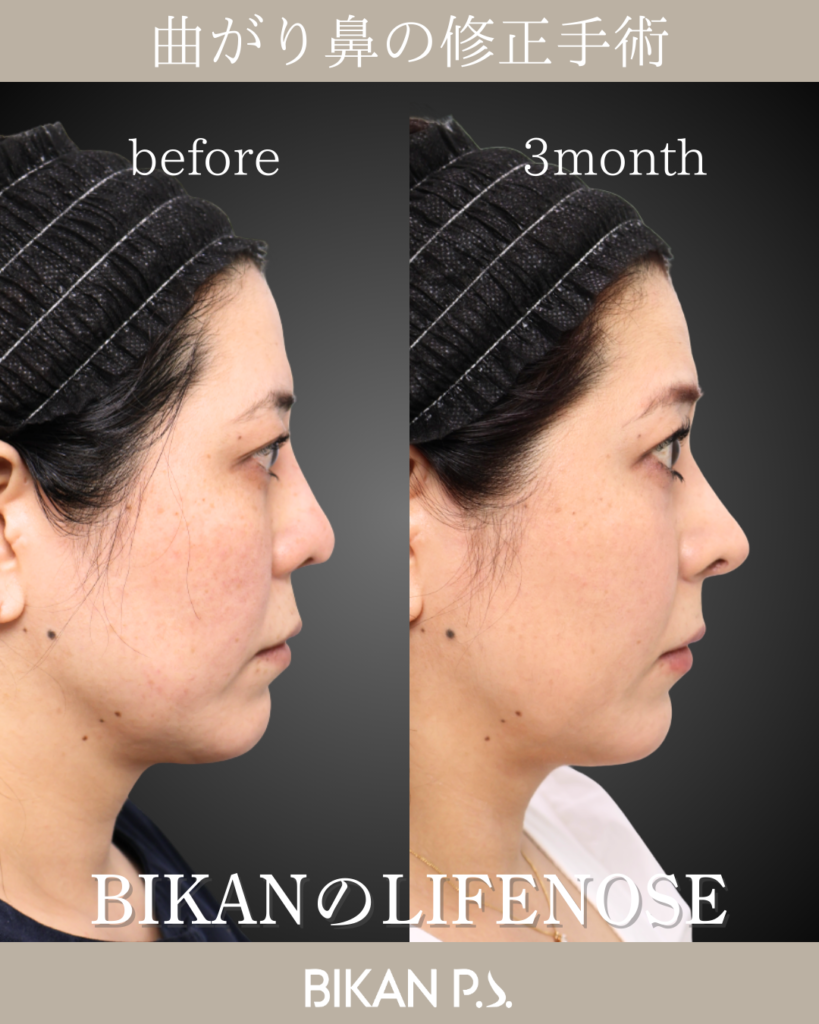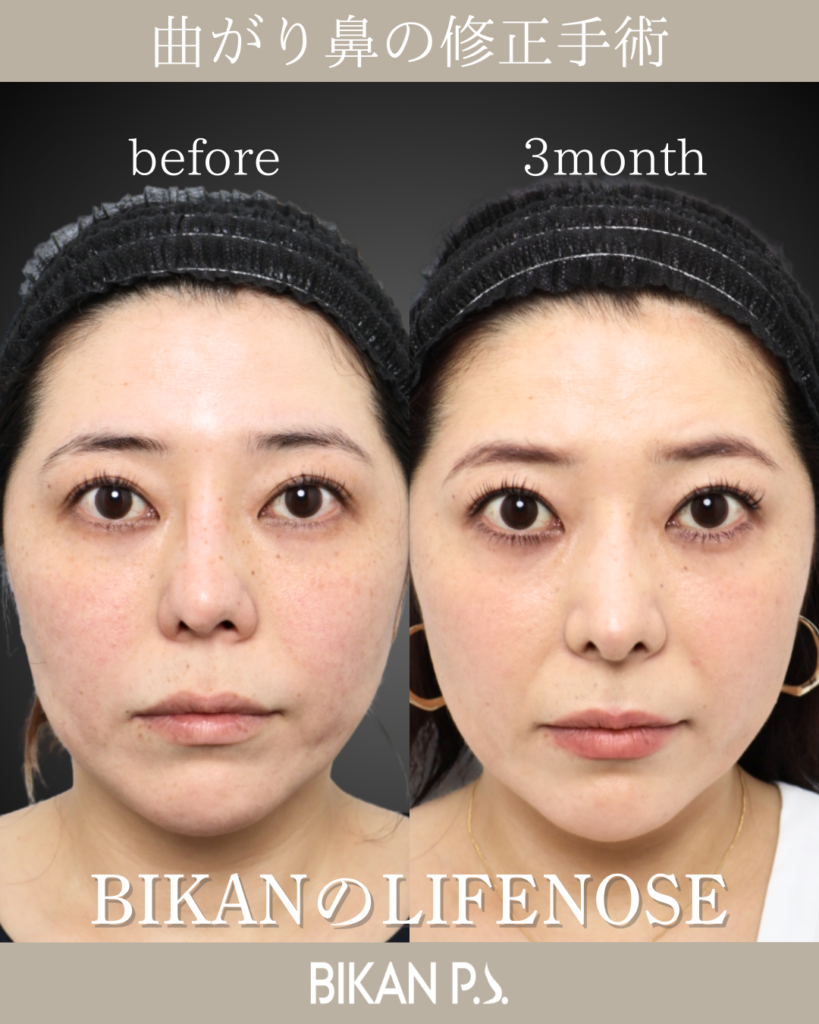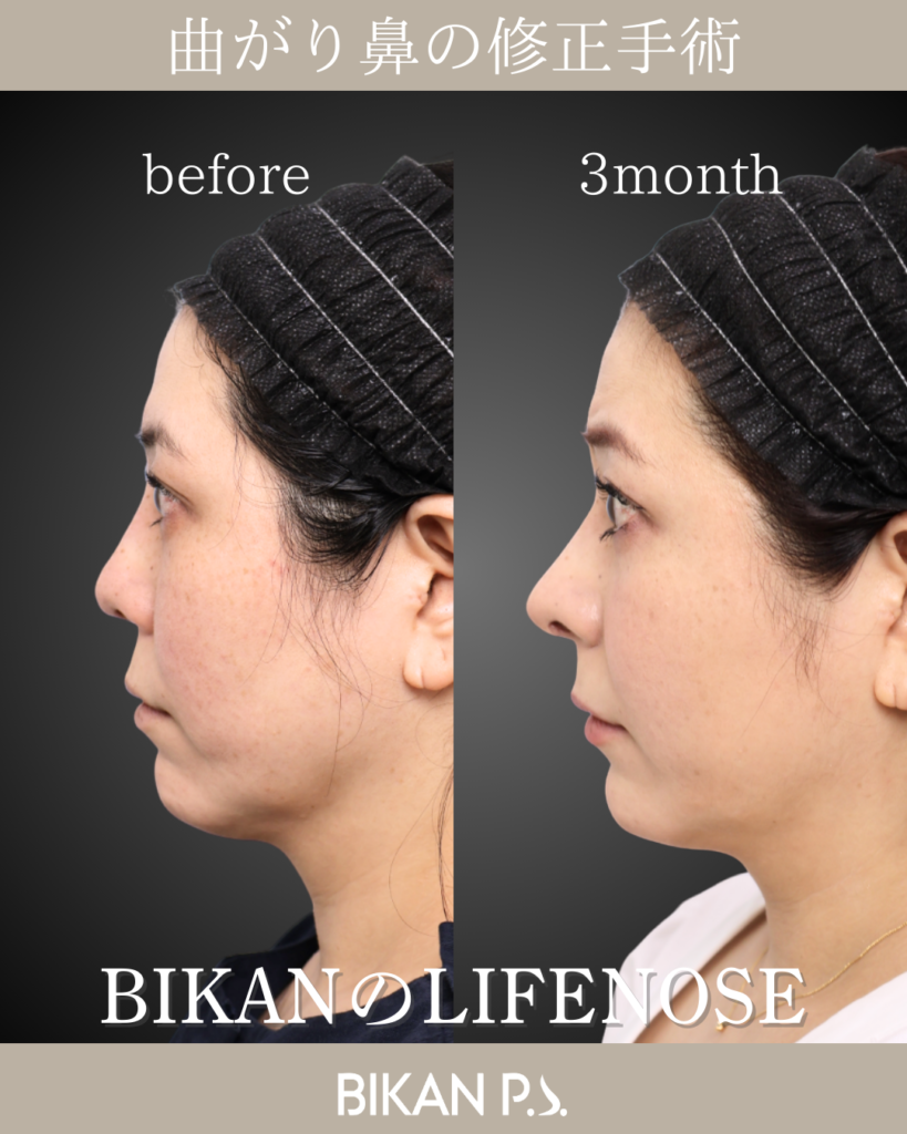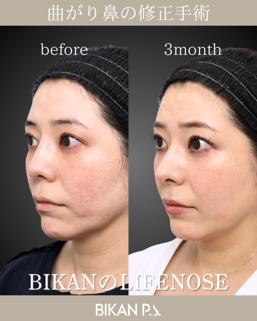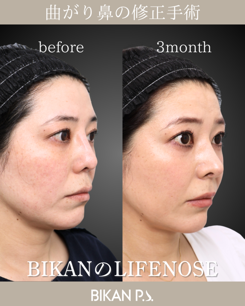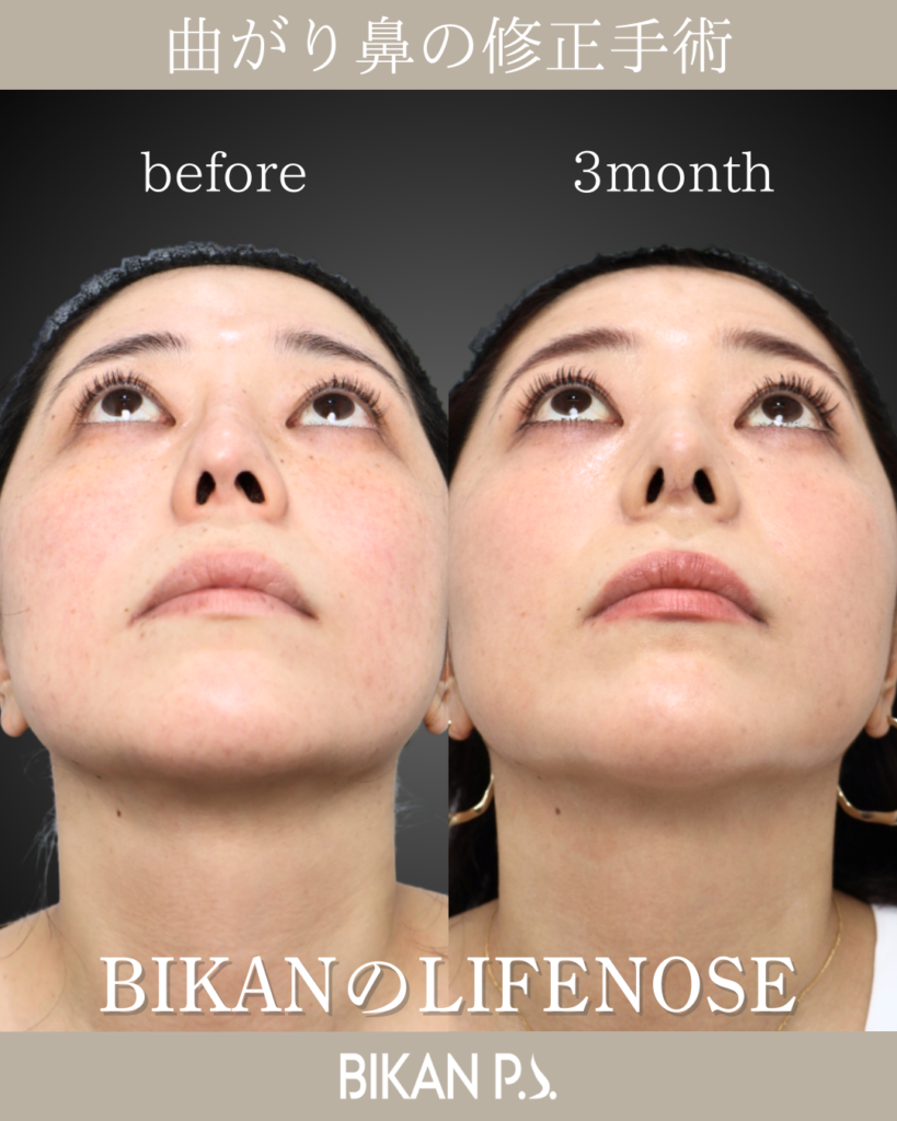 斜鼻の改善を目的に、鼻中隔矯正術と骨切り術を行い、鼻筋の軸を丁寧に調整。